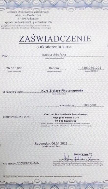 Jestem certyfikowanym dietetykiem, naturoterapeutą, hipnoterapeutą oraz zielarzem-fitoterapeutą. W mojej pracy łączę wiedzę naukową z mądrością natury, pomagając odzyskać równowagę i dobre samopoczucie.